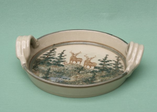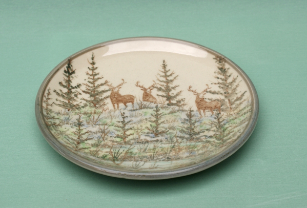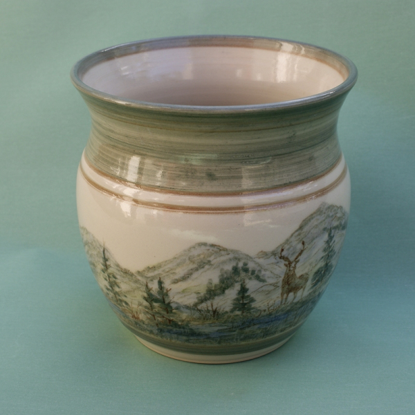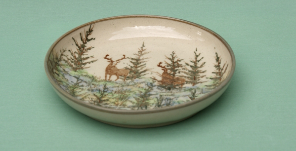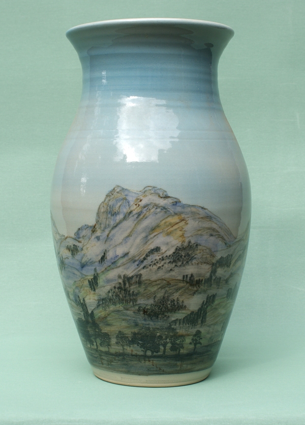 I use under glaze colour with a clear glaze on top for the Landscape ceramics. As each is hand painting it takes time to make a piece if there is a fault in the firing or glazing, you have to make a new one. So they are expensive to make. All the pottery will go in the oven, microwave and dishwasher. Some of following where made for commissions.